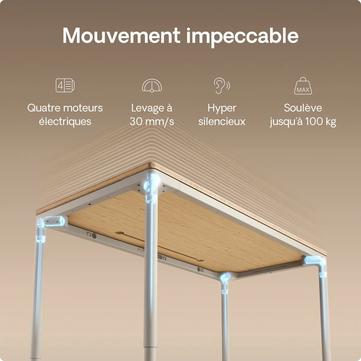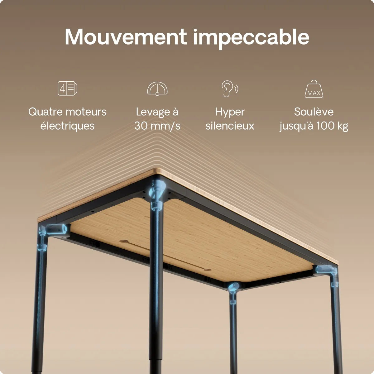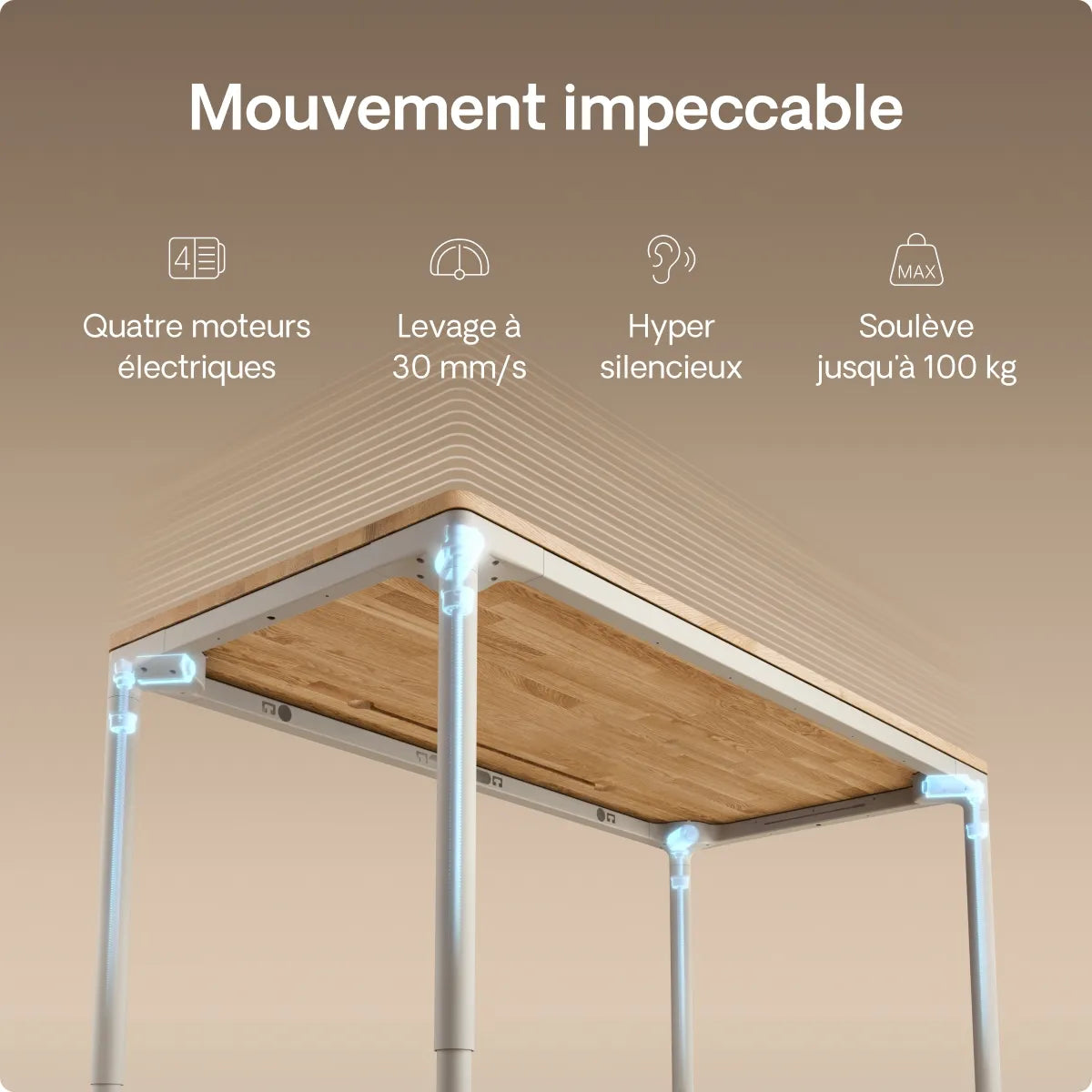 Quatre moteurs de précision sont cachés dans chaque pied pour alimenter ce bureau réglable en hauteur de manière silencieuse et parfaitement synchronisée. Deux fois plus de puissance et une vitesse de 30 mm/s pour un déplacement sans effort et à l'épreuve du temps.