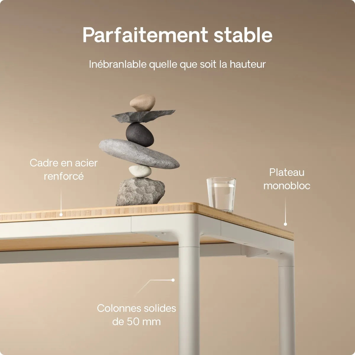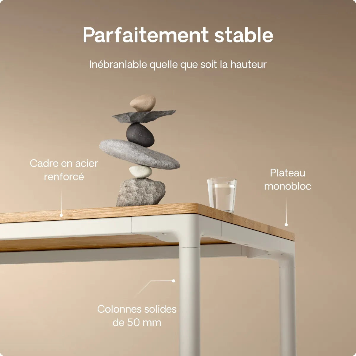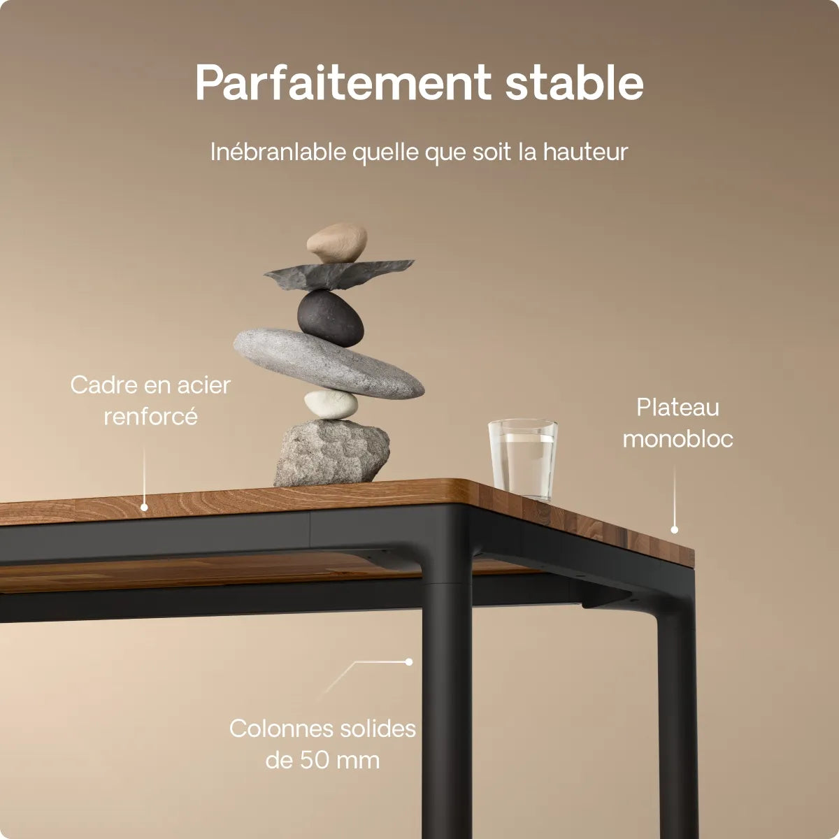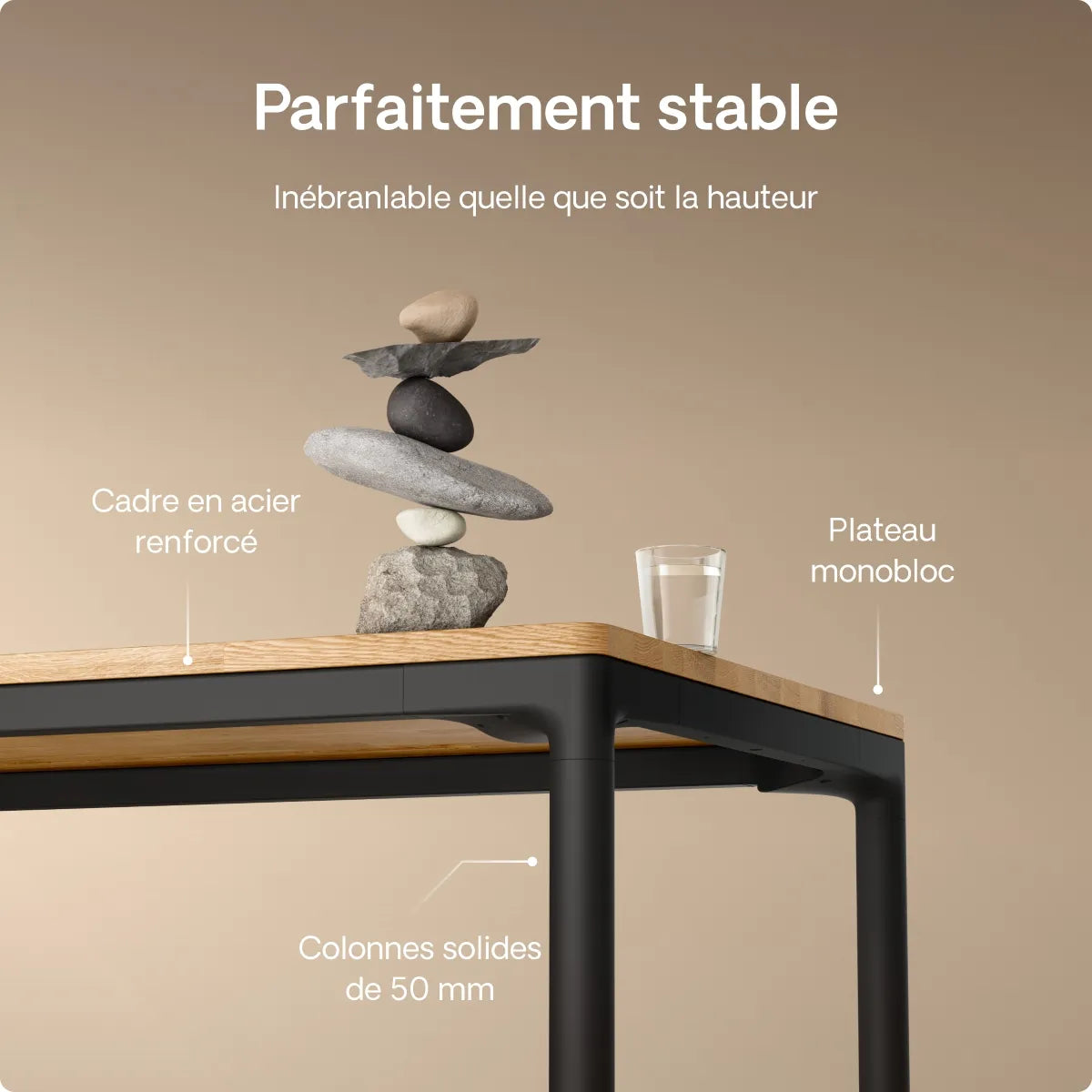 Grâce à ses pieds en métal extra-solides et à son cadre renforcé, le bureau offre une stabilité incroyable. Il reste parfaitement stable et ne vacille pas, même à la hauteur maximale et quelle que soit la taille du plateau.
