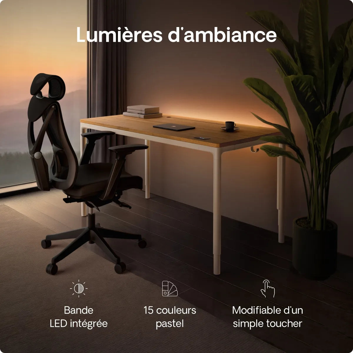 Une bande LED intégrée avec 15 modes de lumières vous met dans une ambiance de travail, de créativité ou de relaxation. Des nuances froides pour la concentration aux tons plus chauds pour la détente, chacun y trouve son compte.