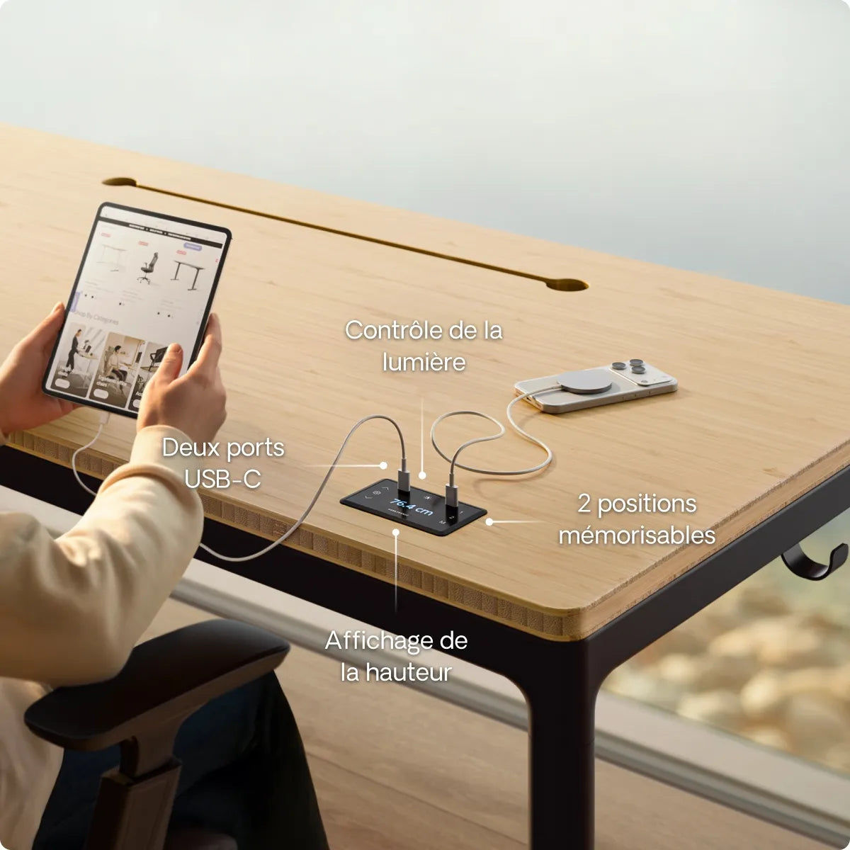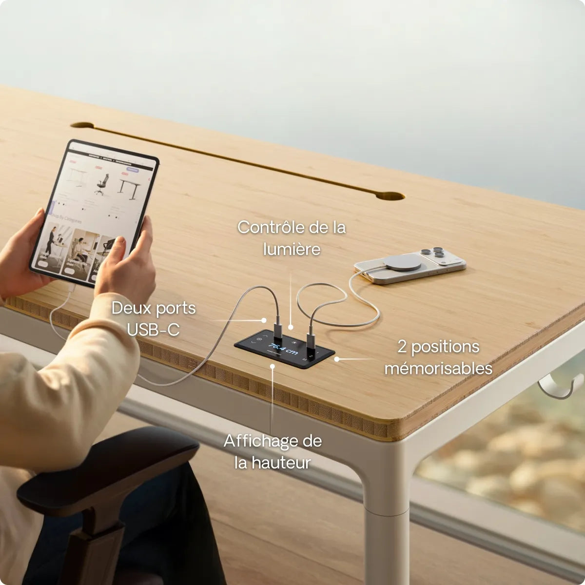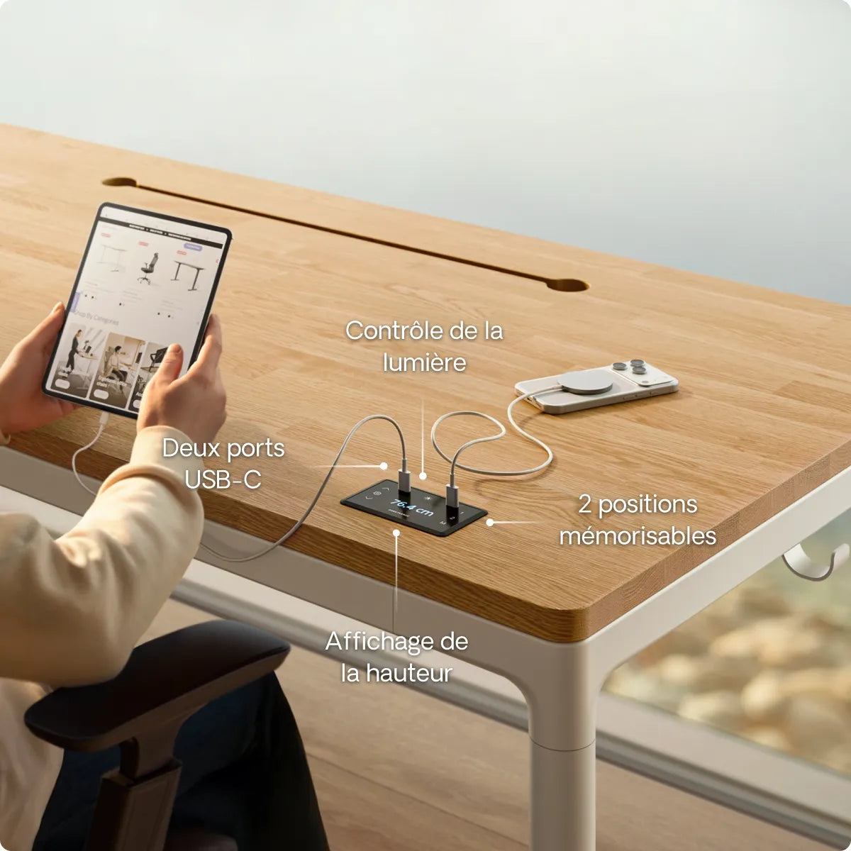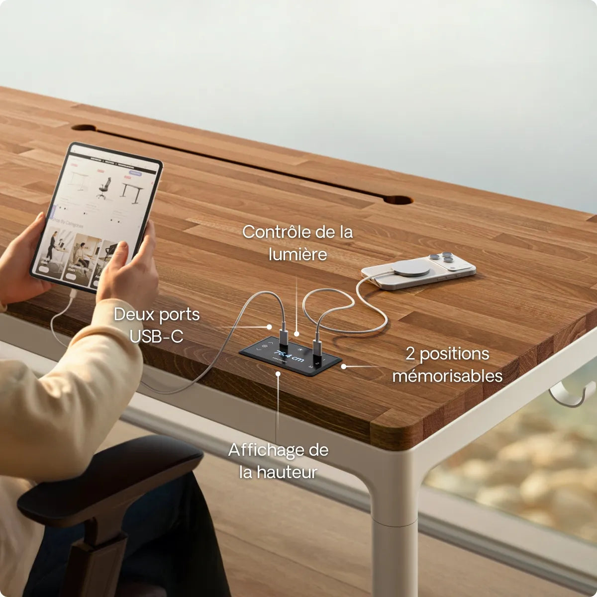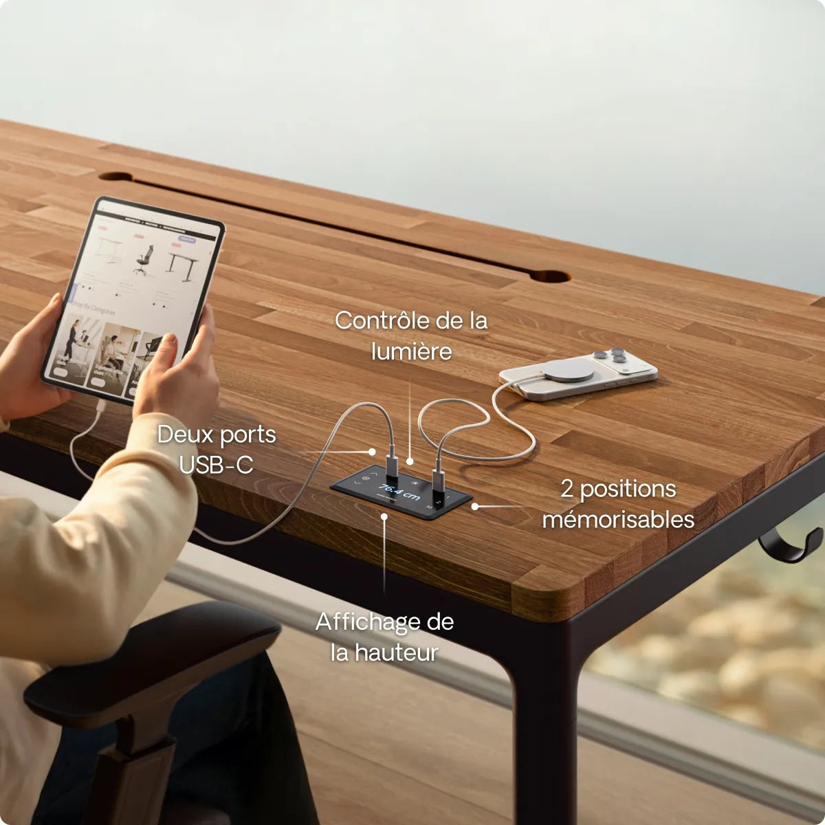 L'écran tactile encastré se fond naturellement dans le plateau et vous donne un accès instantané à vos hauteurs enregistrées, aux deux ports de charge USB-C et à la commande des LED. Tout est intuitif, simple et à portée de main pour un contrôle facile.