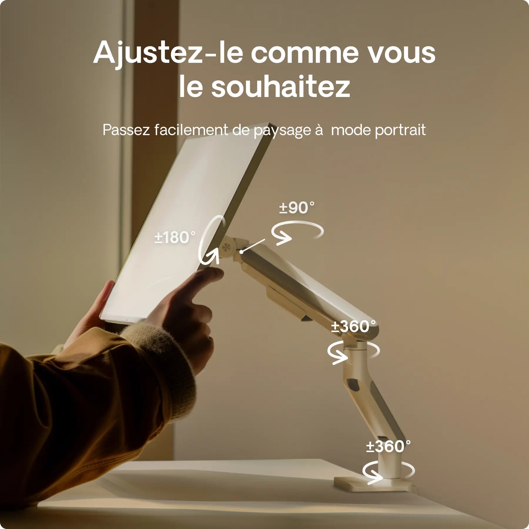 Les supports de moniteurs offrent une rotation de 360° pour passer facilement du mode paysage au mode portrait. Leurs bras réglables assurent une visualisation optimale et réduisent la tension de la nuque.