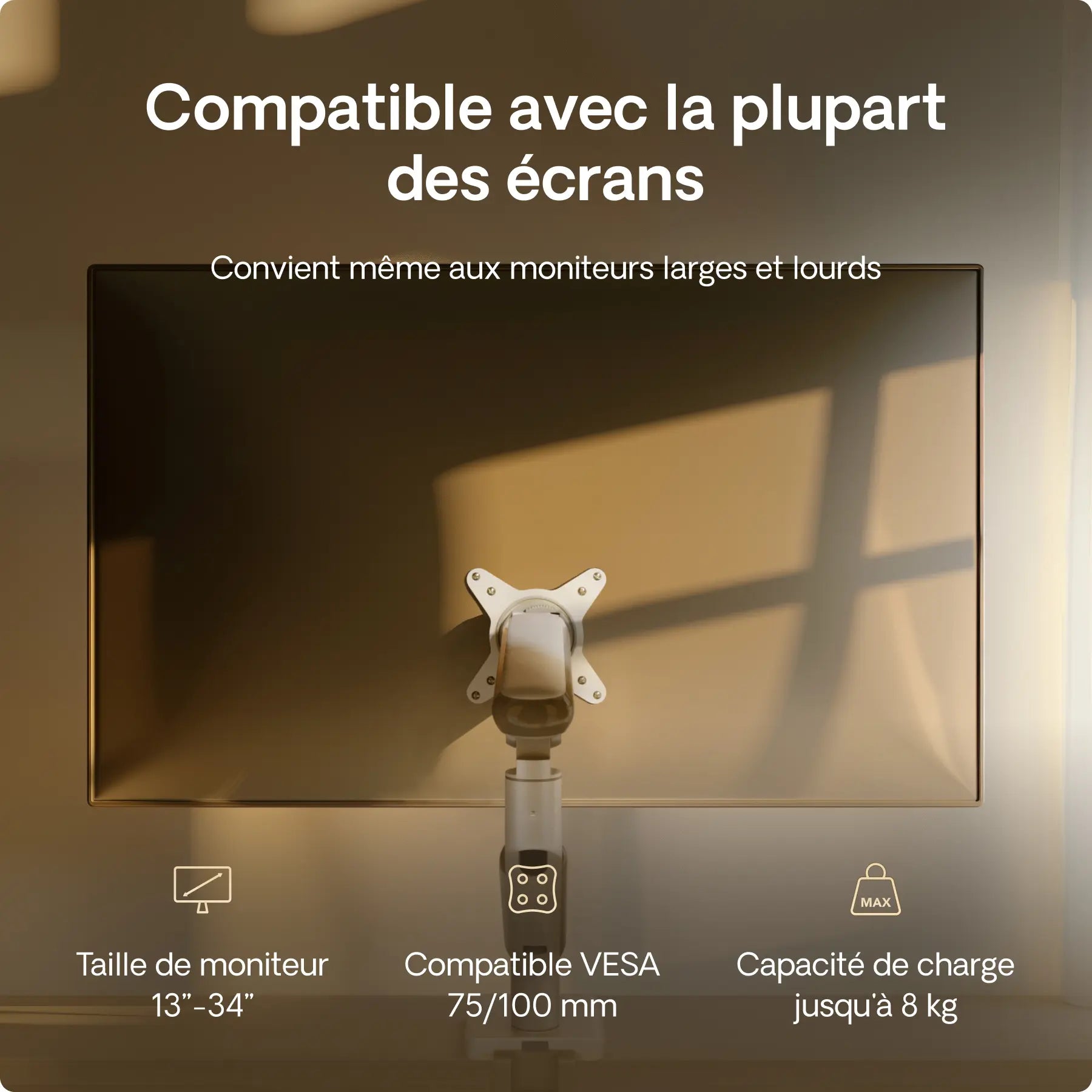 Ces supports de moniteur sont compatibles avec une large gamme de moniteurs, permettant un montage sans effort et sans restriction de taille ou de marque. Ils figurent parmi les supports les plus solides, les plus légers et les plus polyvalents du marché.