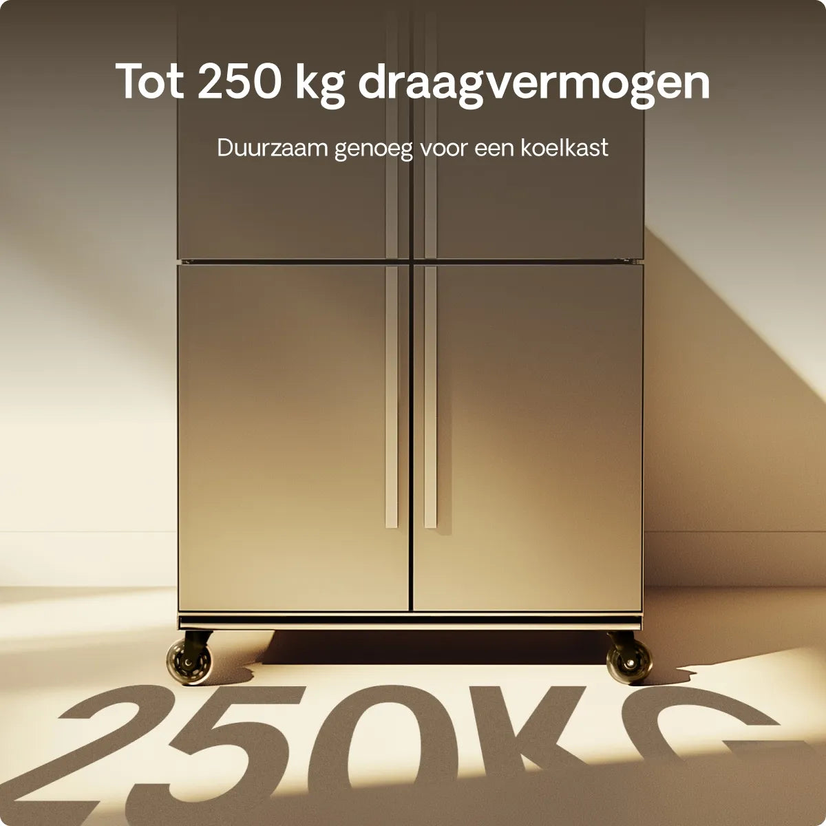 Dankzij de hoogwaardige lagers en de zware stalen as is het maximale draagvermogen van deze wielen 250 kg - sterk genoeg om een koelkast te dragen.