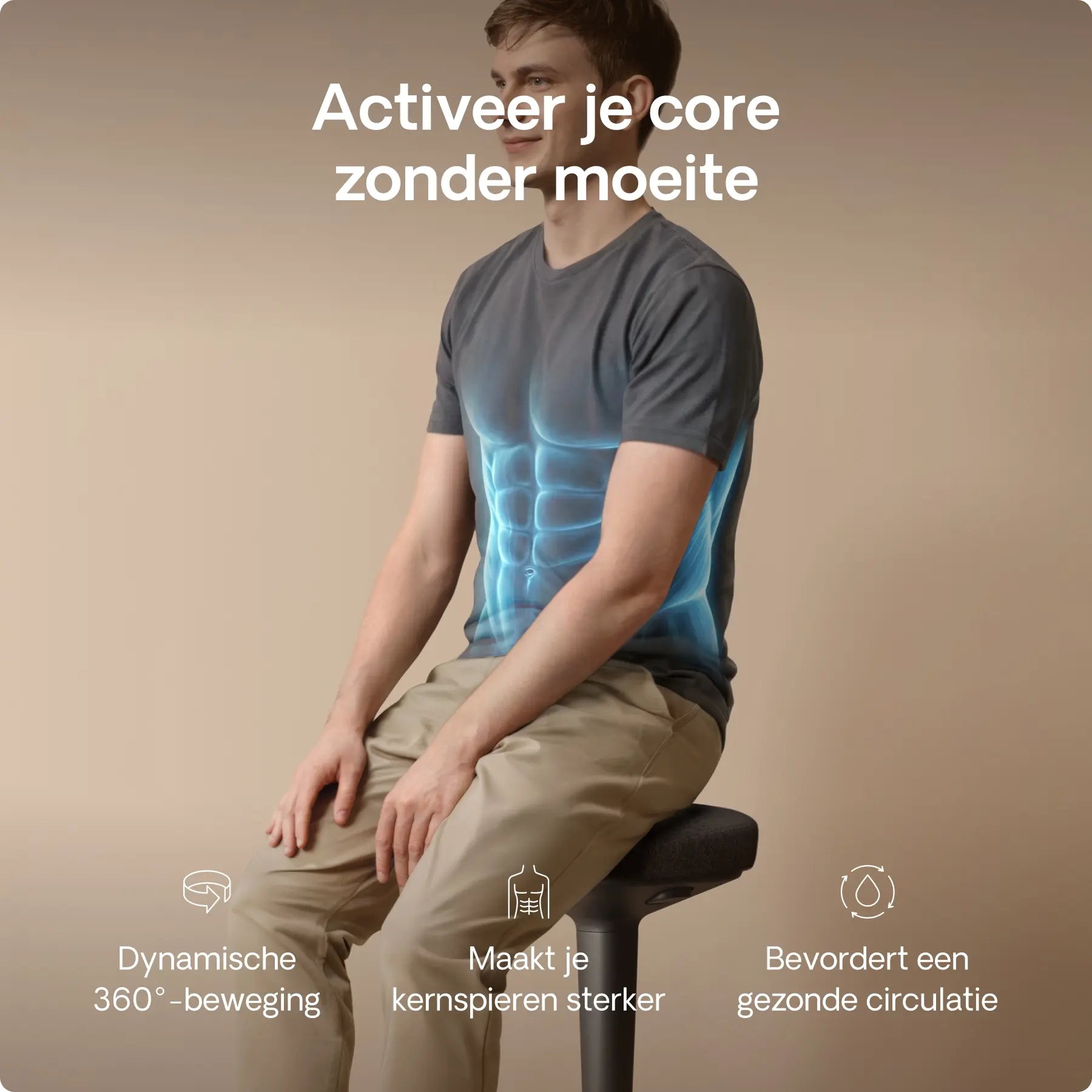 Het verandert zitten in beweging. De balanskruk activeert je core en zorgt voor een actieve houding, waardoor je de hele dag gefocust, energiek en comfortabel blijft. In tegenstelling tot een traditionele bureaustoel voegt deze ergonomische kruk een zachte beweging toe die je rug en natuurlijke houding ondersteunt.
