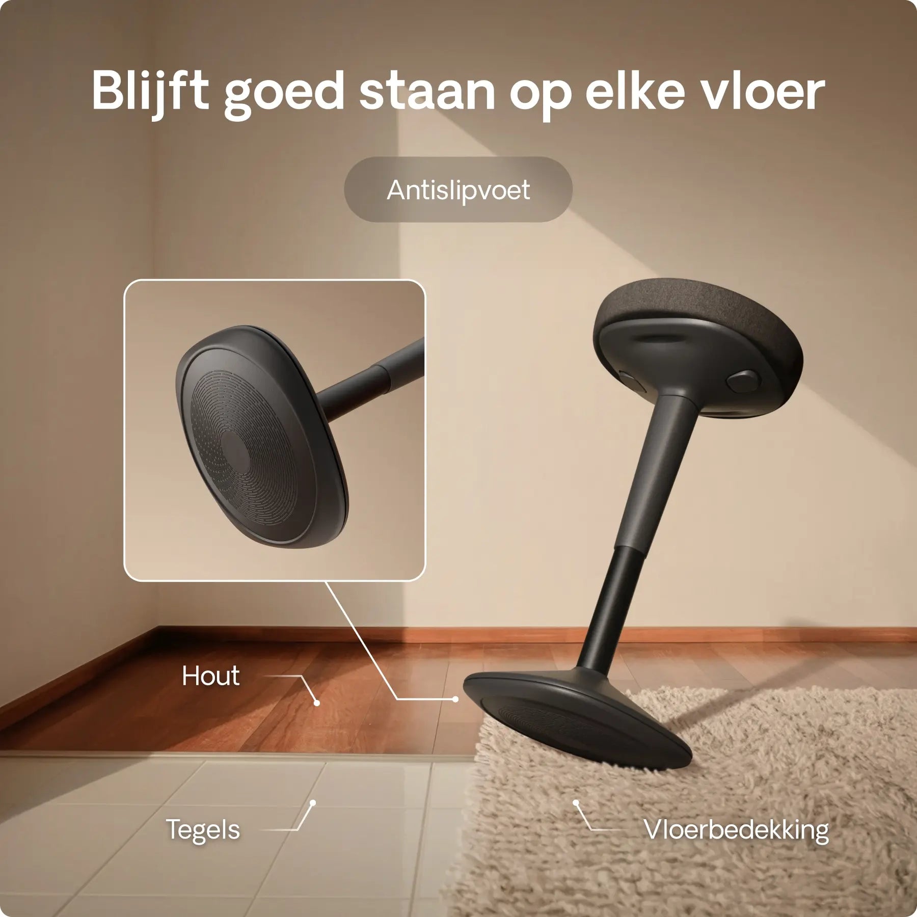 Een stevig frame van polypropyleen, veilig getest schuim met hoge dichtheid en een duurzame stoffen bekleding. Elk detail is ontworpen voor comfort, balans en langdurig gebruik. De hoogwaardige materialen zorgen ervoor dat het lang meegaat, of je het nu als balansstoel of zit-sta-stoel gebruikt.