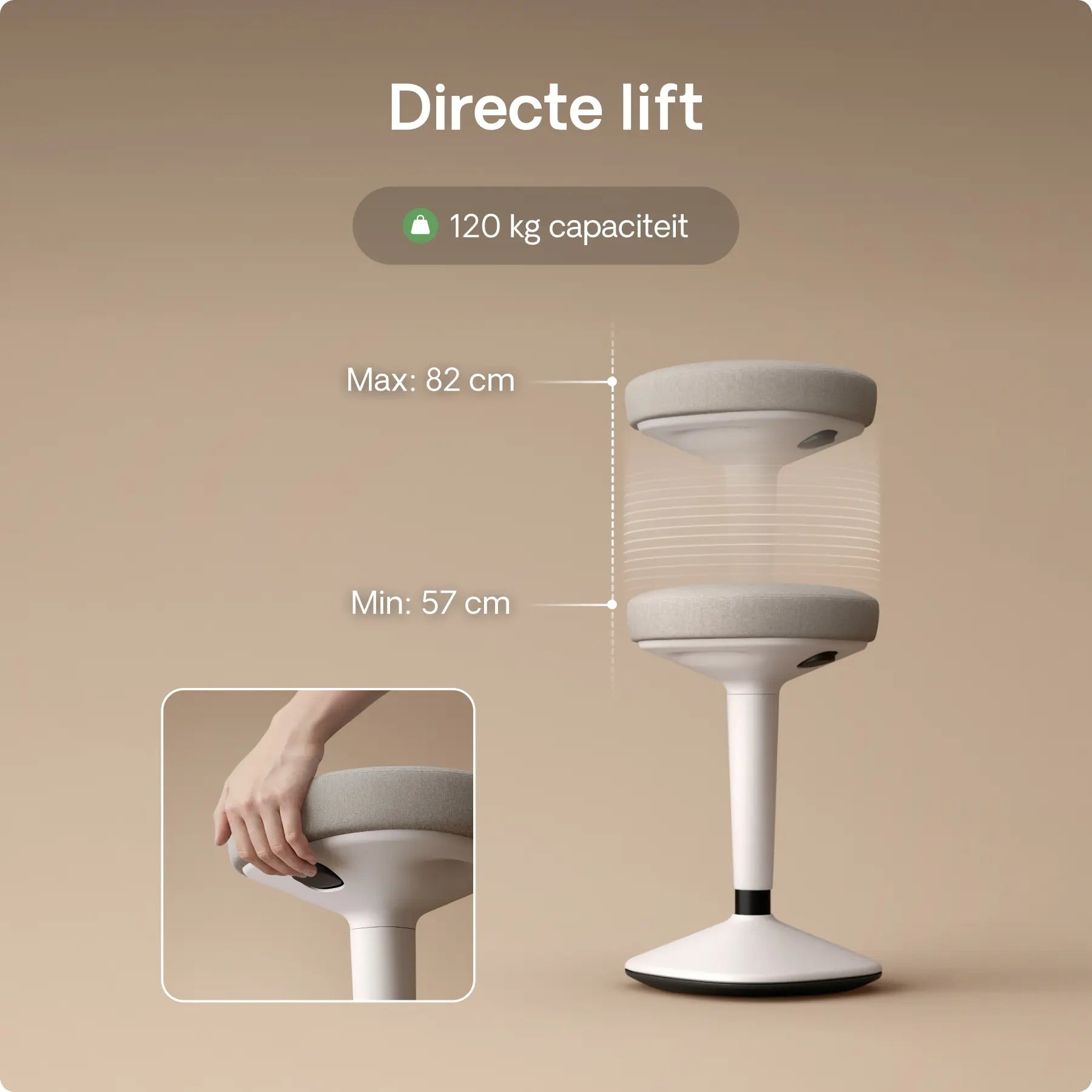 De balanskruk kun je met één druk op de knop aanpassen van 57 tot 82 cm, zodat je lekker flexibel zit, of je nu laag of hoog wilt zitten. Dit maakt het een perfecte zit-sta-kruk voor moderne werkplekken en past natuurlijk bij elk in hoogte verstelbaar bureau.