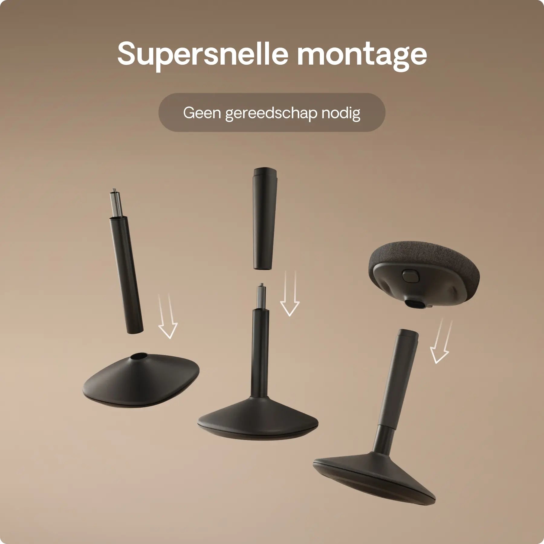 Ja. De kruk wordt geleverd in vier delen en is binnen een paar minuten opgezet. Je hebt geen gereedschap nodig. Het is licht en compact, dus je kunt het makkelijk verplaatsen naar waar je het nodig hebt. De verzwaarde, antislipvoet zorgt ervoor dat het stabiel staat op elk oppervlak: van houten vloeren tot tegels of tapijt. Een simpel ontwerp dat goed past in elke ergonomische opstelling.