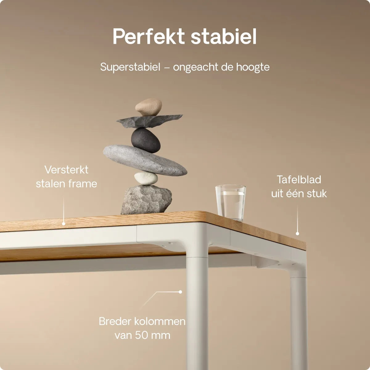 Het elektrische frame met vier poten en bredere, versterkte kolommen zorgt voor een superstabiele basis op elke hoogte: geen trillingen, geen wiebelen, geen compromissen. Met een draagvermogen tot 100 kg blijft elke opstelling veilig staan.