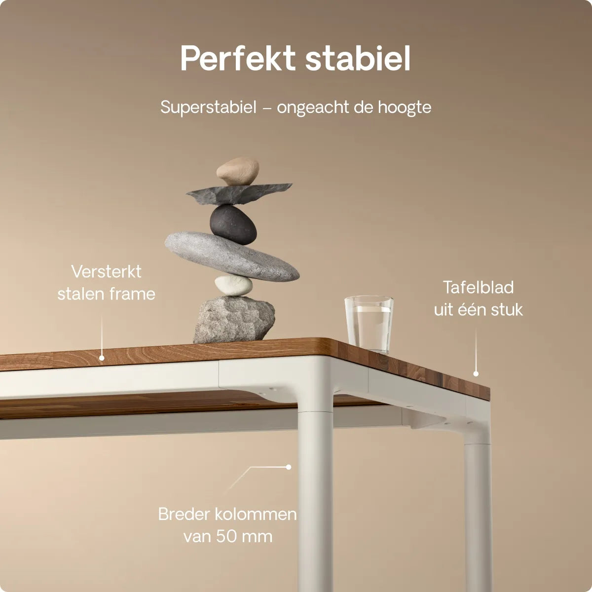 Dankzij de extra sterke metalen poten en het versterkte frame biedt de tafel een ongelooflijke stabiliteit. Hij blijft perfect stabiel en wiebelt niet, zelfs niet op maximale hoogte en met elk formaat tafelblad.