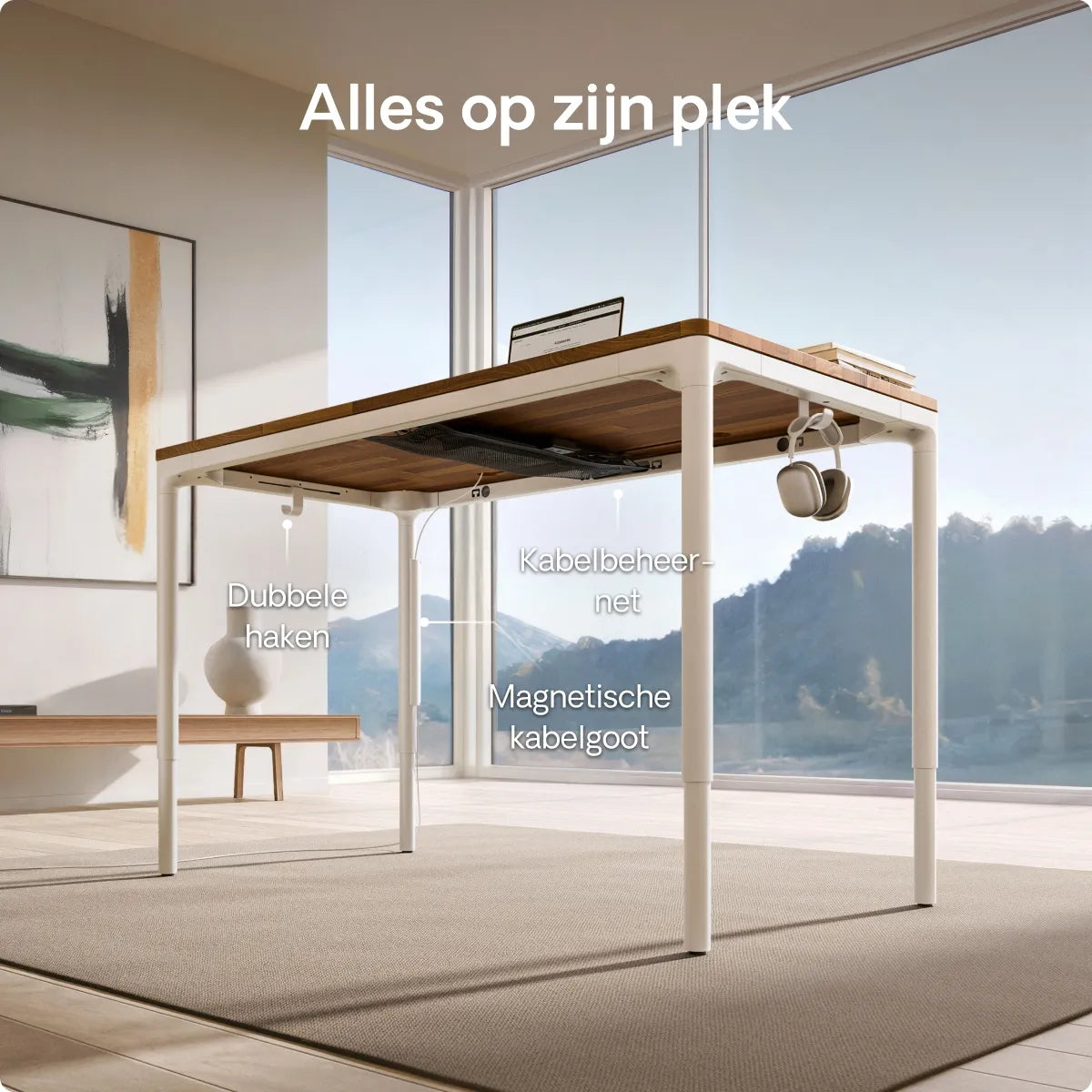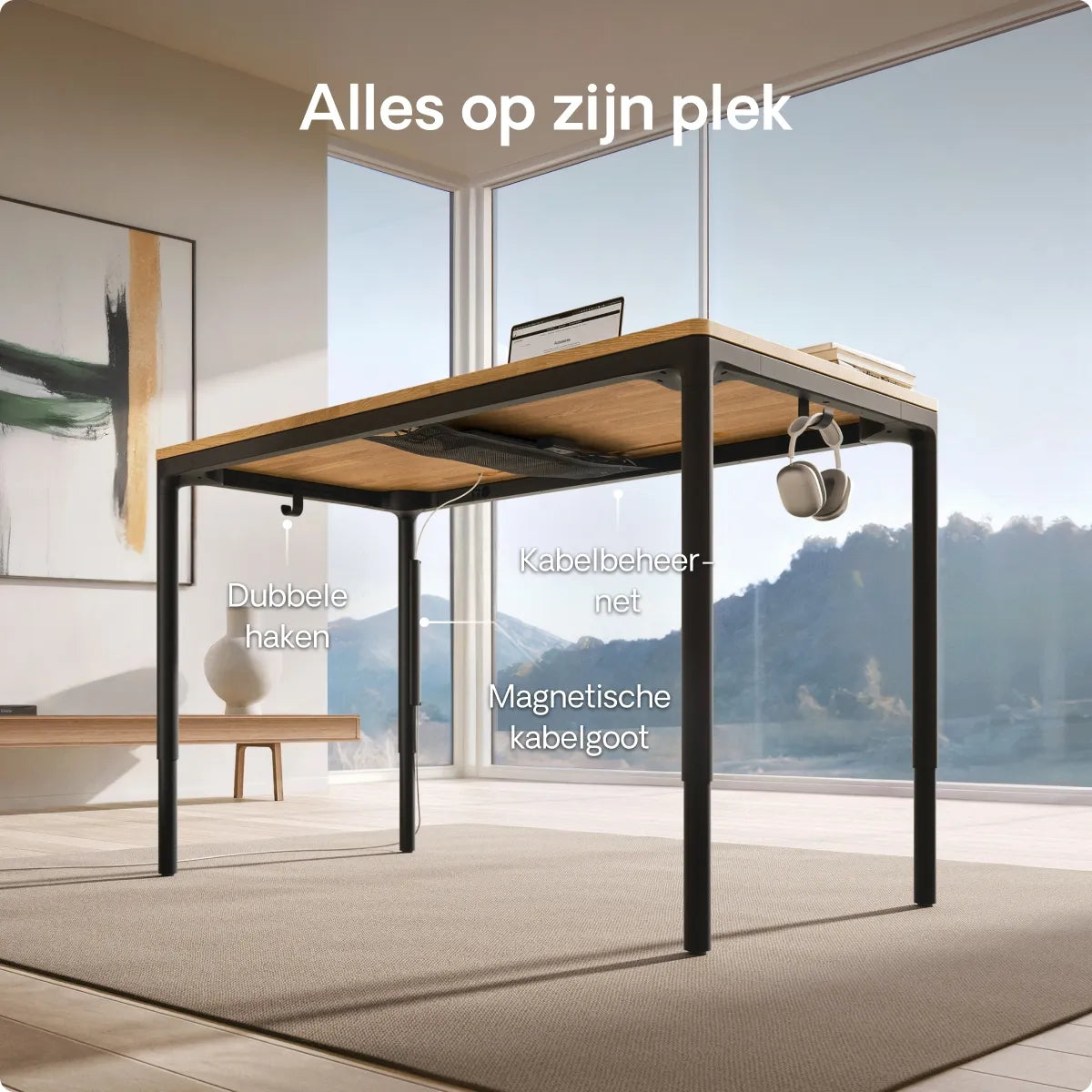 Het tafelblad is gemaakt van duurzaam Europees laminaat van 25 mm dikte voor een stijlvolle uitstraling en langdurige sterkte. Bestand tegen krassen en morsen, met naadloze randen voor extra veiligheid en stijl. Dankzij de dubbele kabelgoot kun je kabels gemakkelijk beheren en is hij perfect voor dagelijks gebruik.