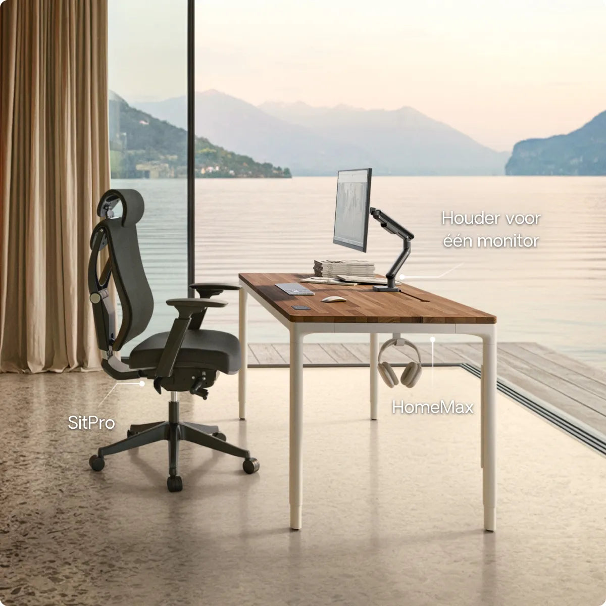 De HomePro, met zijn sterke metalen poten en extra verstevigd frame, blijft perfect stabiel op elke hoogte en met elk tafelbladformaat, zonder dat je je zorgen hoeft te maken over je schuddende scherm of die volle mok met koffie.