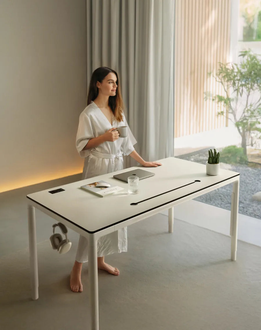 Vier superprecieze geïntegreerde motoren, verborgen in elke poot, zorgen ervoor dat dit in hoogte verstelbare bureau stil en perfect synchroon beweegt, met een snelheid tot 30 mm/s. Twee keer zo krachtig. Moeiteloze beweging. Gemaakt om lang mee te gaan.